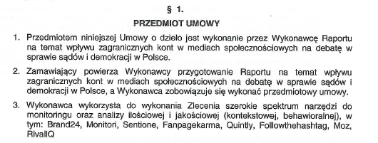 13 października przyszły odpowiedzi. Dowiedzieliśmy się, że raport został zlecony firmie Apostołowie Opinii i kosztował podatnika prawie 15 tys. zł. (cała umowa) Z wypowiedzi Pawła Szefernakera można było wnioskować, że informacje dotyczące wpisów z zagranicznych kont na temat sądów są częścią jakiejś większej analizy dotyczącej mediów społecznościowych, jednak tak nie było. W umowie z Apostołami Opinii jest mowa o przygotowaniu analizy pod kątem wpływu zagranicznych podmiotów na debatę wokół sądów: