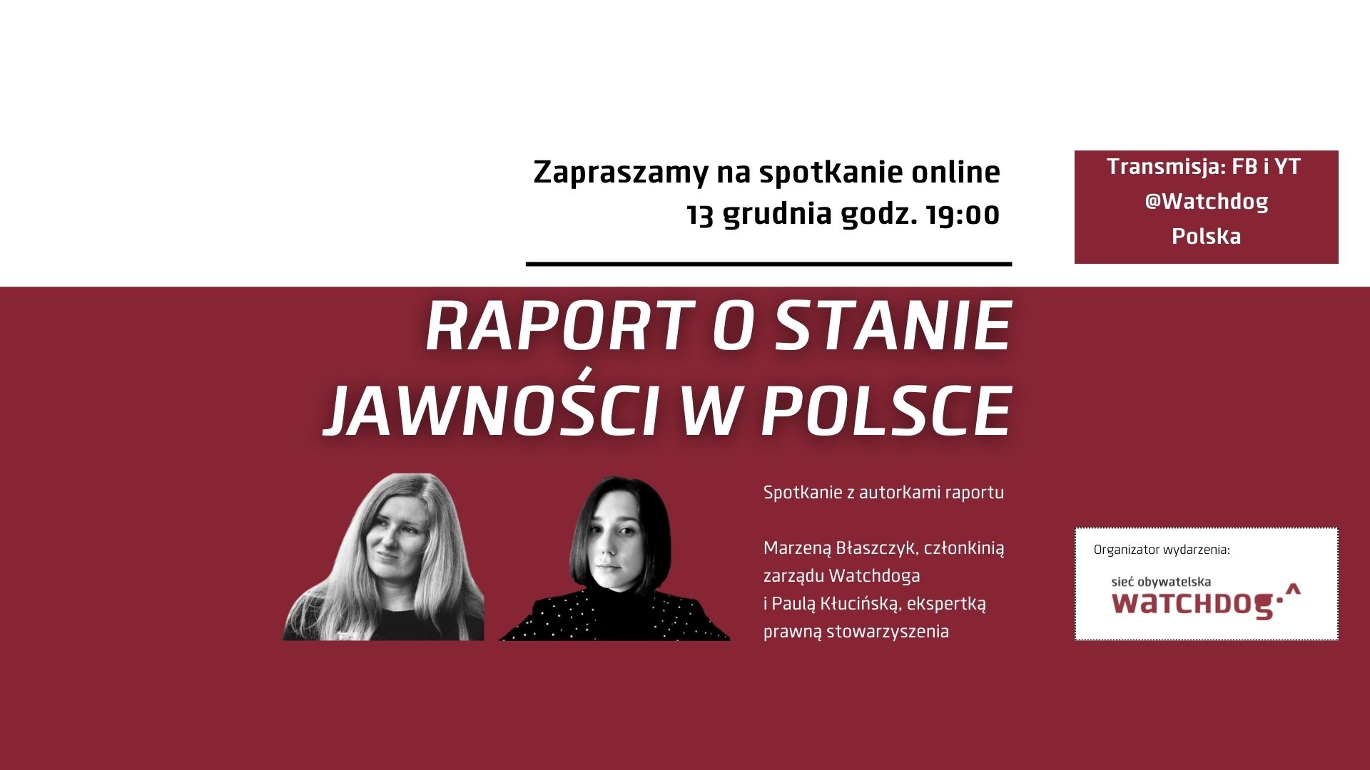 O raporcie opowiedzą jego autorki — Marzena Błaszczyk, członkini zarządu Watchdoga i Paula Kłucińska, ekspertka prawna stowarzyszenia, a rozmowę poprowadzi Martyna Bójko. Przewidujemy czas na pytania (prosimy o zadawanie ich komentarzach pod transmisją).