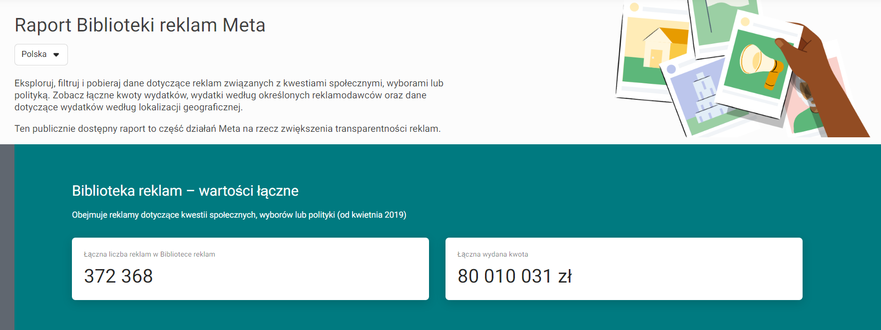 Na stronie witają nas informacje podobne do tych, które możemy znaleźć w narzędziu Google’a. Ogólne statystyki zbierane są od kwietnia 2019 r., nieporównywalne ze względu na znacznie szerszą kategorię podmiotów, pokazują, że na chwilę obecną w Bibliotece dla Polski zarejestrowano 372 368 reklam, na które przeznaczono 80 010 031 zł. Możemy też sprawdzić wyniki innych krajów.