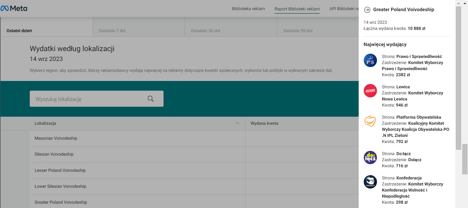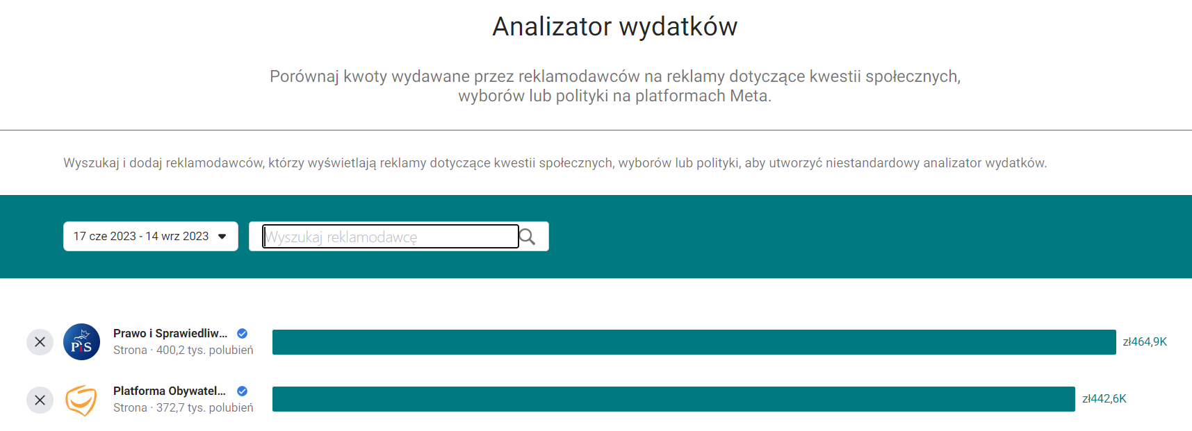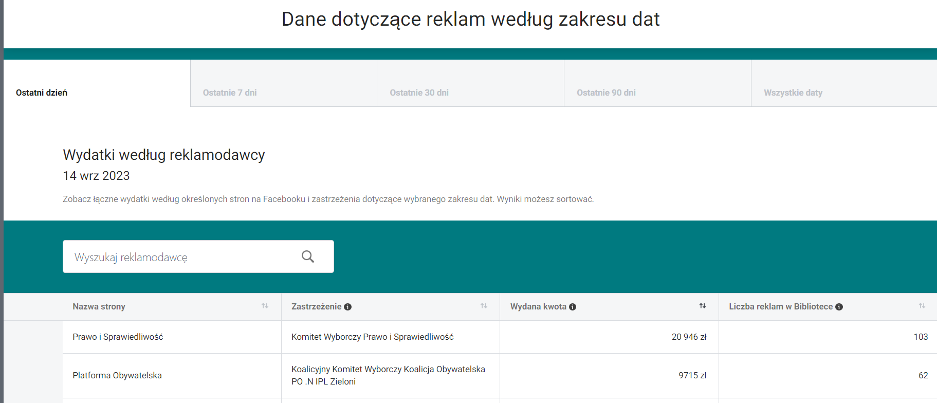 Niżej znajdziemy dane o wydatkach z podziałem na partie i komitet wyborczy dla wszystkich reklam, znów, w z góry zdefiniowanych przez Metę zakresach czasowych i choć sprawdzam je 19 września, dane sięgają tylko 14 września. Stąd też nie kuszę się na razie o analogiczne zestawienie, jak w przypadku reklamy komitetów wyborczych w Google’u.