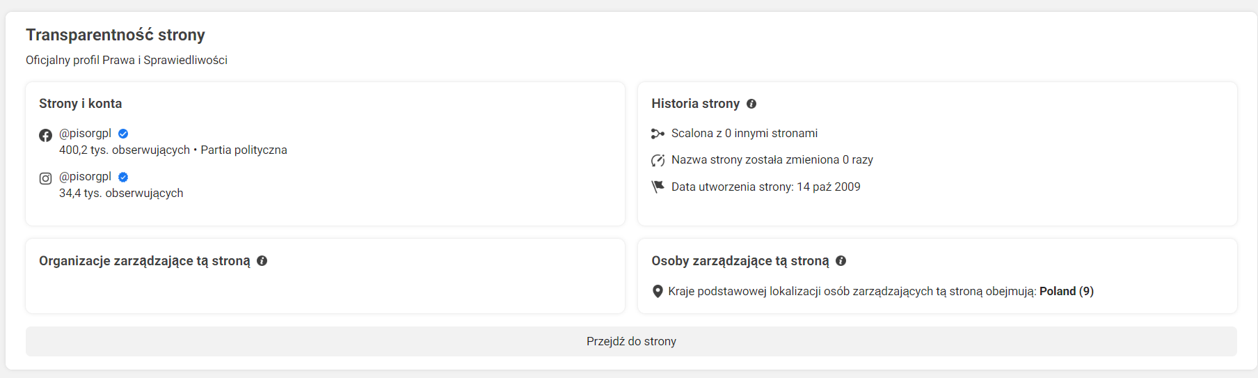 Wracając do widoku strony i przechodząc do zakładki „Informacje”, sprawdzimy dane dotyczące stron na Facebooku i Instagramie profilu publikującego reklamy.