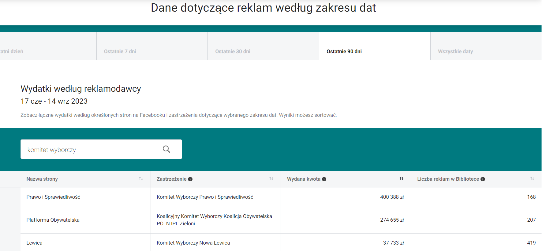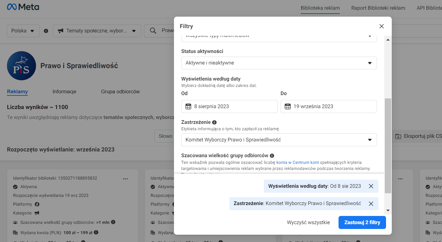 W narzędziu od Mety nie możemy względnie łatwo wyszukać komitetów wyborczych i śledzić ich aktywności. Wyszukując np. hasło „komitet wyborczy”, pokazuje nam się lista stron — tzn. profili partii, konkretnych kandydatów z kolumną o nazwie „Zastrzeżenie”, gdzie znajdziemy adnotację o komitecie wyborczym. Widok jest ograniczony do predefiniowanych zakresów dat.