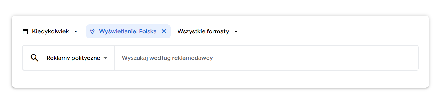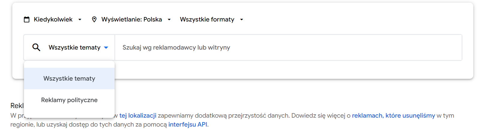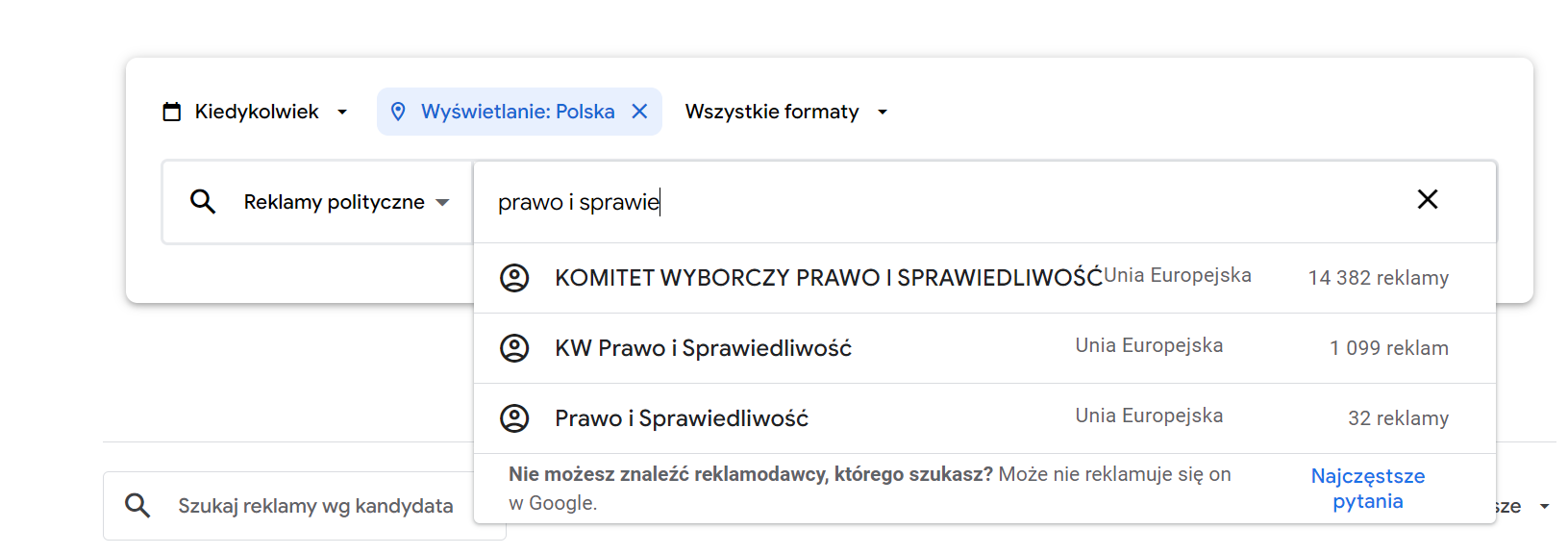Jeśli interesują nas reklamy i wydatki konkretnej partii, komitetu, polityka, najlepiej skorzystać z wyszukiwarki. Obok niej znajdziemy ikonę kalendarza, możemy więc wybrać interesujący nas zakres czasowy lub zobaczyć wszystkie zebrane informacje. Domyślnie wyszukiwarka najpewniej wyświetli informacje na temat reklam publikowanych na terenie Polski, ale możemy to zmienić, gdy będziemy chcieli przyjrzeć się, jak wygląda to za granicą. Tymczasem skupmy się na Polsce. Jeśli interesuje nas konkretny format reklamy – graficzna, tekstowa lub wideo, można go wybrać z listy bądź zostawić domyślne “wszystkie formaty”.
