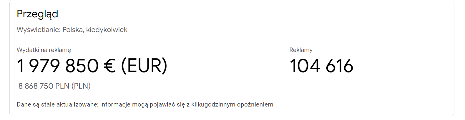 Baza danych o reklamach politycznych w Polsce sięga 21 marca 2019 r., można dowiedzieć się, że od tego czasu do 19 września 2023 r., Google wyświetlało na terenie naszego kraju 104 616 reklam politycznych, na które wydano 8 868 750 złotych, czyli blisko 2 mln euro.