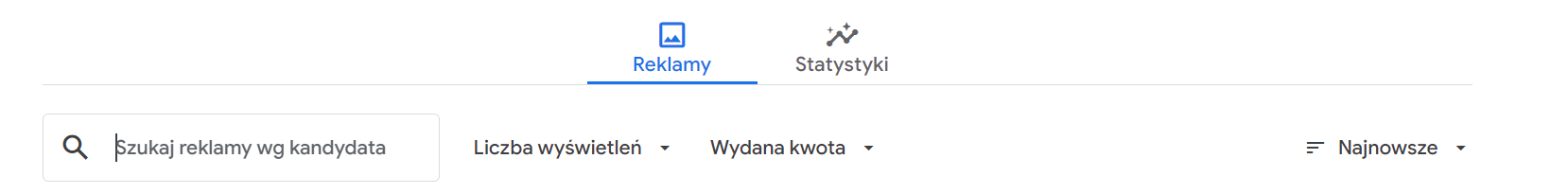 Pod wyszukiwarką znajdziemy strumień reklam politycznych opublikowanych w Google, który można uporządkować według kryteriów związanych z liczbą wyświetleń, datą publikacji lub przejrzeć zbiorcze statystyki. Klikając na konkretną reklamę, można zobaczyć,do kogo jest skierowana pod względem wieku, płci, lokalizacji (kodu pocztowego), kryteriów kontekstowych (np. miejsca docelowe reklam, tematy i słowa kluczowe w witrynach, aplikacjach, filmach i na stronach) – to zdaniem Google jedyne kryteria, jakie pozwala uwzględnić w przypadku tzw. targetowania reklamy politycznej.