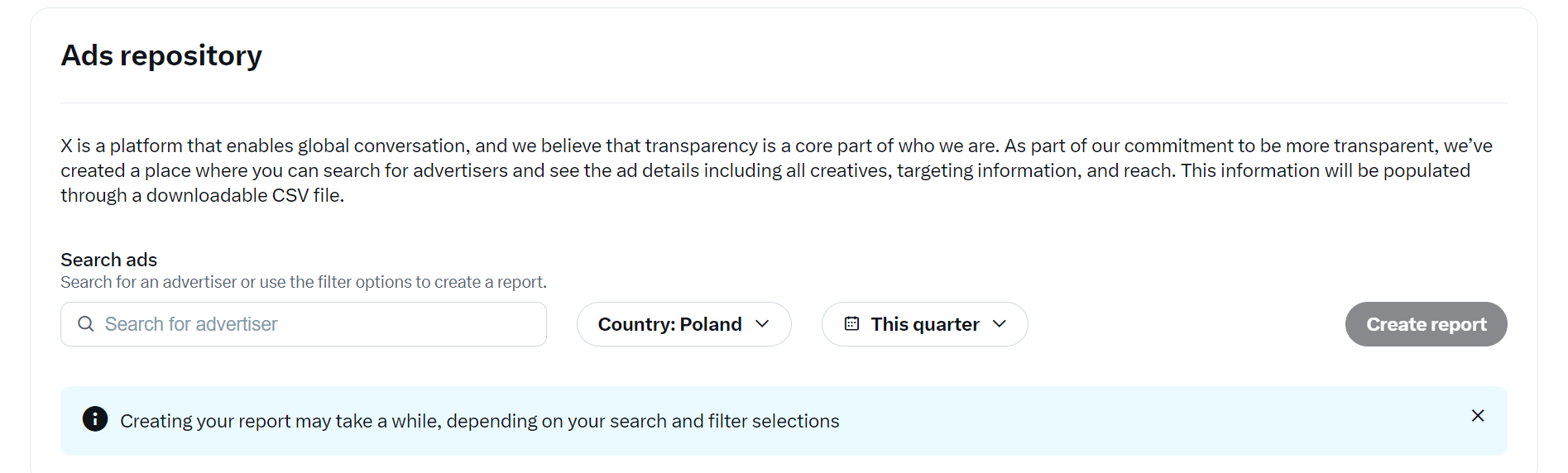 Nowsze zestawienia możemy wygenerować za pomocą wyszukiwarki dostępnej na stronie Ads repository. Nie ma tu żadnych ogólnych statystyk i gotowych informacji, stronie brakuje też polskiej wersji językowej. Jedyne, co nam pozostaje, to wyszukanie konta reklamodawcy, wybranie kraju i zdefinowanego przez X zakresu czasowego (dziś, wczoraj, 7 dni, kwartał) lub swojego, ale tylko od 25 sierpnia tego roku.