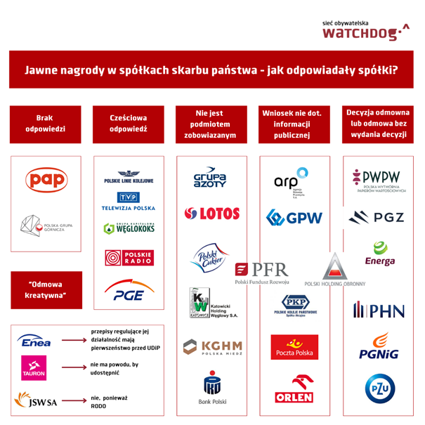 Spółki skarbu państwa nigdy nie grzeszyły szczególną transparentnością. Przekonaliśmy się o tym choćby przy okazji naszego wniosku o informację z 2018 roku, który dotyczył jubileuszowych nagród z okazji stulecia odzyskania przez Polskę niepodległości. Kiedy po 5 latach postanowiliśmy podsumować historię tego wniosku, mieliśmy za sobą ponad 20 wygranych spraw sądowych i niezbyt wiele danych. Spółki wykazały się dużą kreatywnością, jeśli chodzi o odpowiedzi, co dobrze oddaje poniższa grafika.