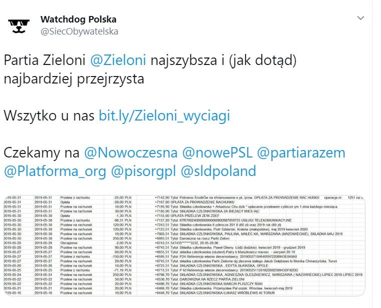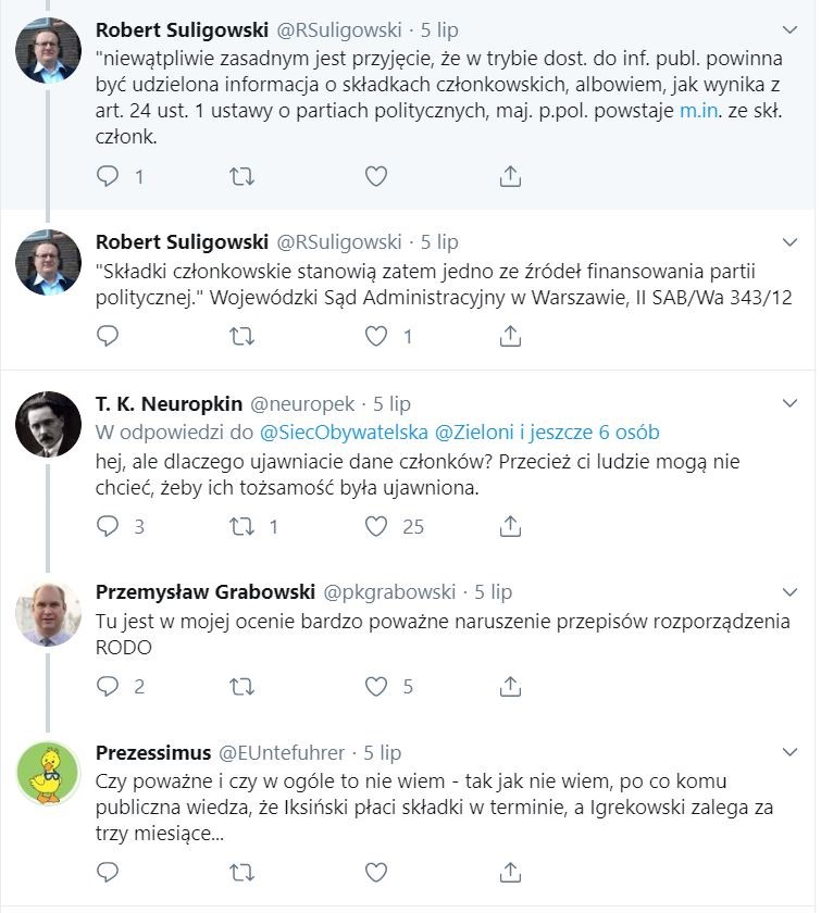 Warto zwrócić uwagę na dyskusję, jaka wywiązała się na Twitterze, a dotyczyła udostępnionych przez Partię Zielonych informacji o osobach wpłacających składki. Akurat w danych SLD te informacje zostały wyłączone z jawności. Poniżej publikujemy kilka wpisów.
