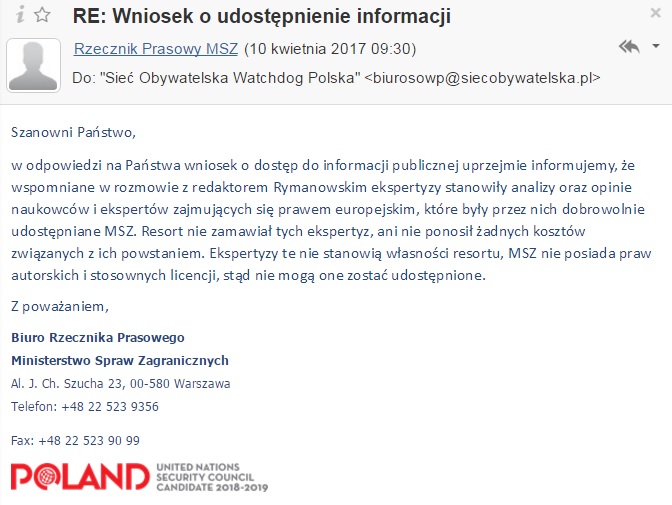 Chcieliśmy poznać ekspertyzy, o których mówił minister. Sieć Obywatelska Watchdog Polska 27 marca 2017 r. skierowała do MSZ-u wniosek o udostępnienie: