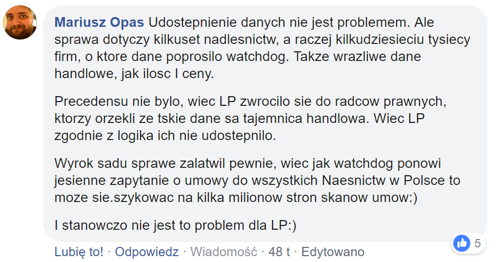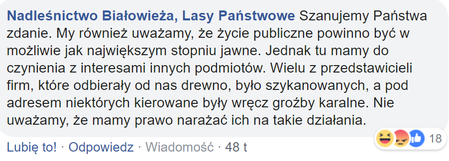 Tymczasem Lasy Państwowe chcą ponownie z automatu odmawiać udostępniania informacji o sprzedaży drewna, „chowając się” za ogólnymi oświadczeniami nabywców drewna, z których nie wynika rzeczywista konieczność ochrony danych. W mojej opinii działanie Lasów Państwowych zmierza do świadomej i nieuzasadnionej odmowy udostępnienia informacji publicznej. Lasy Państwowe nie mogą „namawiać” nabywców drewna do wskazywania, jakie konkretne informacje stanowią tajemnicę przedsiębiorcy, to sami nabywcy powinni określić, jakie dane ich zdaniem nie powinny podlegać udostępnieniu. Takie działanie, w mojej opinii, w przypadku złożenia wniosku o udostępnienie tych informacji i ewentualnej odmowy będzie nosiło znamiona przestępstwa określonego w art. 23 ustawy o dostępie do informacji publicznej: