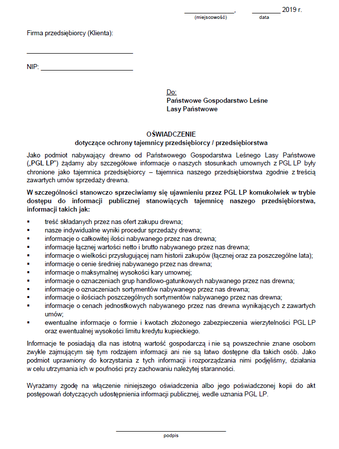 W związku z tym, mając na uwadze toczące się postępowania uprzejmie prosimy każdego Klienta Lasów Państwowych, któremu zależy na ochronie jego tajemnicy przedsiębiorcy (przedsiębiorstwa), o przekazanie do Państwa jednostki macierzystej pisemnego oświadczenia (podpisanego przez osoby uprawnione do reprezentacji) potwierdzającego wyraźny sprzeciw wobec udostępniania informacji stanowiących tajemnicę przedsiębiorcy (przedsiębiorstwa).