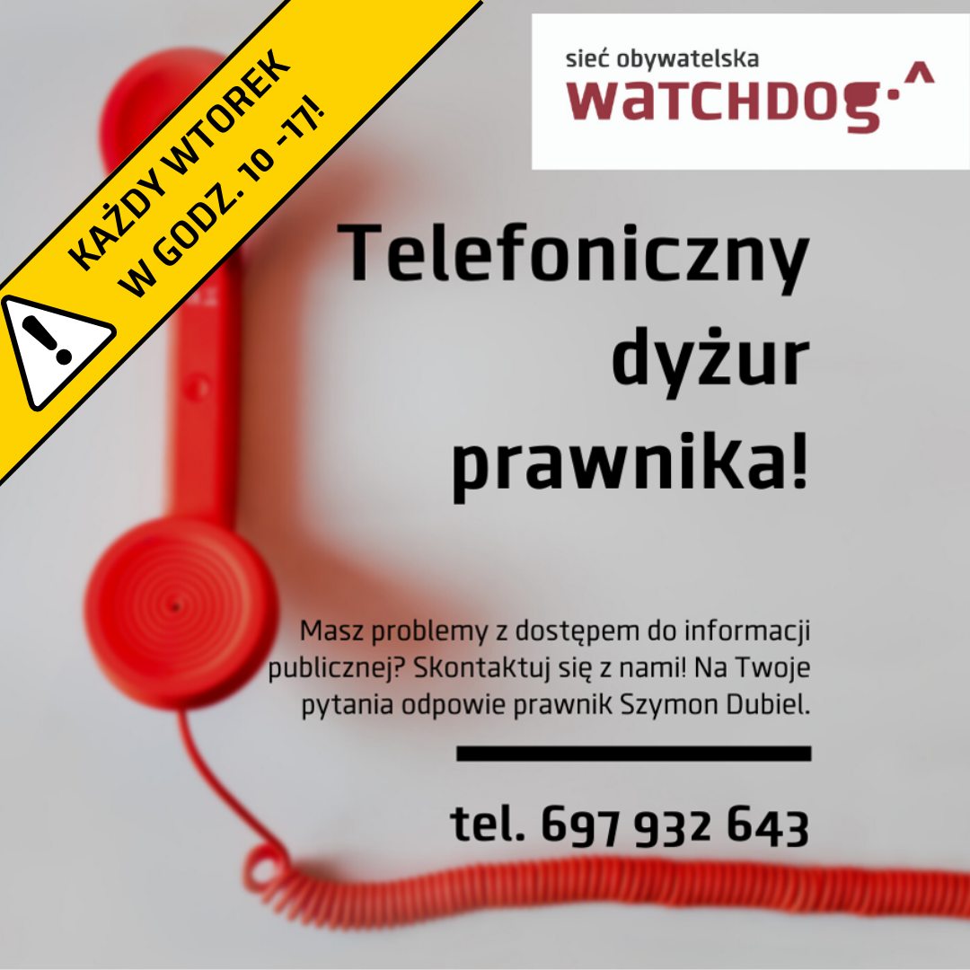 Jeśli masz problem z dostępem do informacji publicznej, możesz zadzwonić w każdy wtorek, miedzy godz. 10.00 a 17.00, do naszego prawnika Szymona Dubiela pod numer 697 932 643.