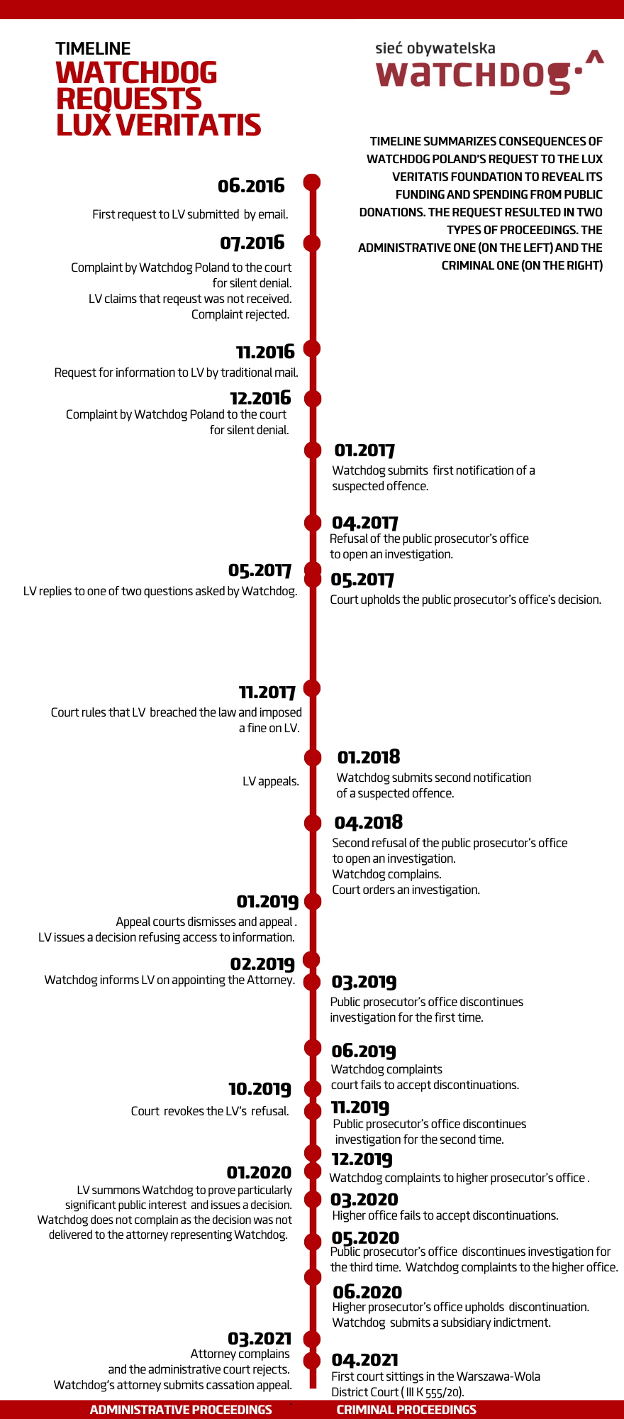 On 11 December 2019, Lux Veritatis summoned Watchdog Poland to prove particularly significant public interest due to the fact that the information requested constituted processed information.Watchdog argued against this approach, claiming that this was simple information that only needs to be searched for as any information before it is disclosed. The Foundation did not accept this argument and on 23 January 2020 it issued a negative decision