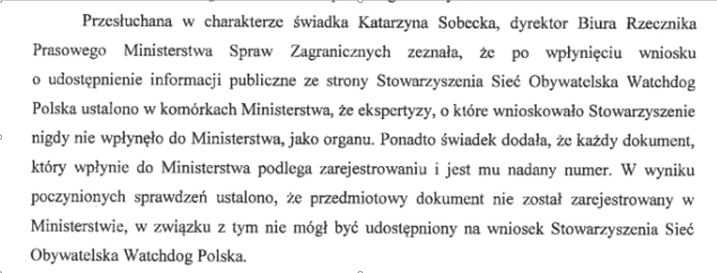 (…) po wpłynięciu wniosku o udostępnienie informacji publicznej ze strony Stowarzyszenia Sieć Obywatelska Watchdog Polska ustalono w komórkach Ministerstwa, że ekspertyzy, o które wnioskowało Stowarzyszenie nigdy nie wpłynęły do Ministerstwa, jako organu. Ponadto świadek dodała, że każdy dokument, który wpłynie do Ministerstwa podlega zarejestrowaniu i jest mu nadany numer. W wyniku poczynionych sprawdzeń ustalono, że przedmiotowy dokument nie został zarejestrowany w Ministerstwie, w związku z tym nie mógł być udostępniony na wniosek Stowarzyszenia (…).