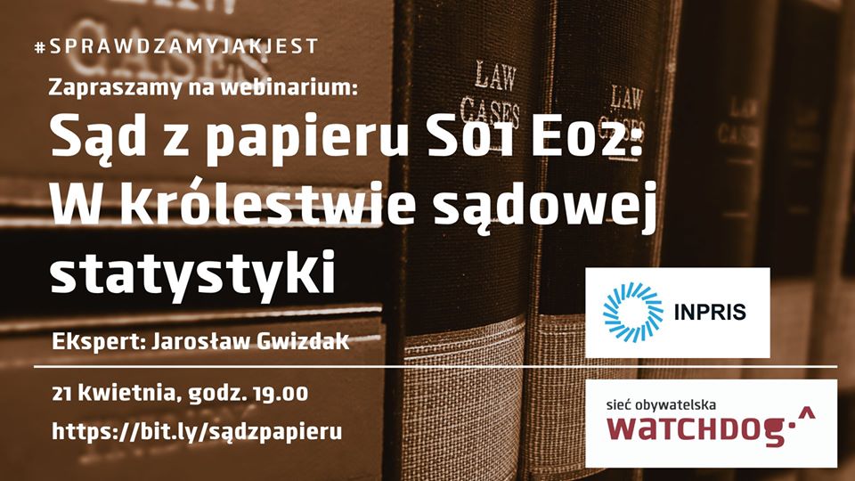 Sieć Obywatelska Watchdog Polska oraz Instytut Prawa i Społeczeństwa zapraszają na webinarium eksperckie pt. “Sąd z papieru S01 E02: W królestwie sądowej statystyki”, które odbędzie się 21 kwietnia 2020 r. o godz.19.00.