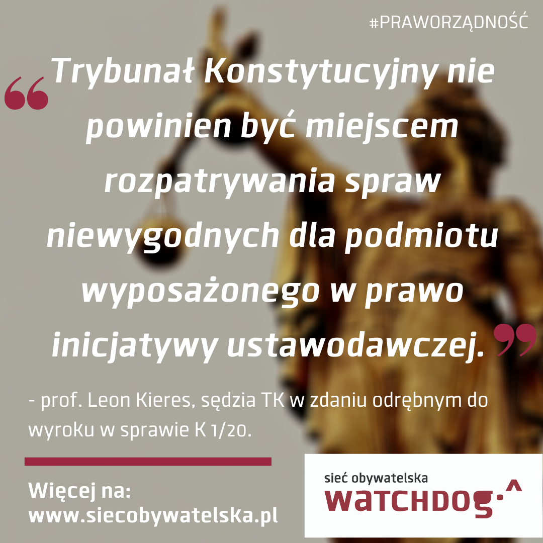 W kontekście „wyroku” Trybunału Konstytucyjnego dotyczącego zgodności z Konstytucją przerywania ciąży ze względu na duże prawdopodobieństwo ciężkiego i nieodwracalnego upośledzenia płodu albo nieuleczalnej choroby zagrażającej jego życiu, podnieśliśmy już kwestię legalności działania Trybunału Konstytucyjnego i powołania sędziów. Te wpływają zarówno na legalność podejmowanych decyzji, jak i na niezależność TK od aktualnie rządzącej większości. Tym razem przedstawiamy Wam zdanie odrębne do wyroku – sędziego TK, prof. Leona Kieresa. Pokazuje on jak daleko zaszedł rozkład praworządności w naszym państwie. Obecnie ustawodawca wyręcza się zależnym Trybunałem Konstytucyjnym do stanowieniu prawa w sprawach niewygodnych, za które trzeba by było ponieść odpowiedzialność polityczną. Ustawodawca, wnioskując do TK, zmienia też przepisy karne z pominięciem reguł tworzenia prawa.
