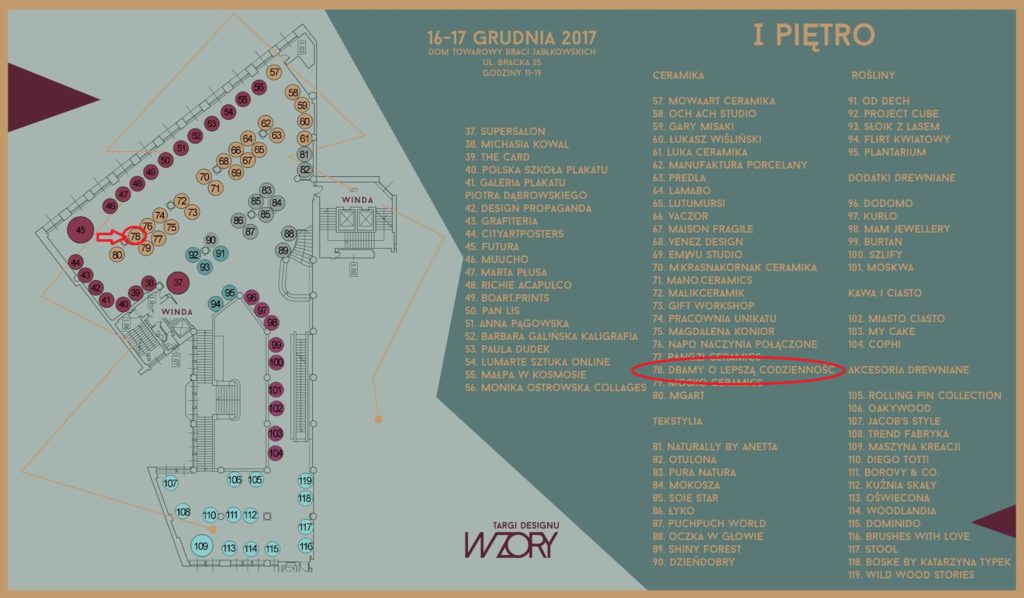 trwają do godziny 19.00 w niedzielę. Nasze stoisko znajdziecie na pierwszym piętrze w dziale Ceramika. Oznaczyliśmy je na mapce poniżej. Będziemy na Was czekać z czajniczkami zaprojektowanymi przez Jana Kochańskiego, szklankami projektu Agnieszki Bar, lustrem Studia Szpunar oraz takimi drobiazgami jak nasze koszulki i notesy. Kupując u nas, wspieracie finansowo naszą działalność, za co bardzo dziękujemy! Tutaj znajdziecie link do wydarzenia na Facebooku.
