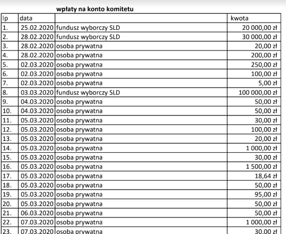 - danych o wszystkich wpłatach na rzecz Komitetu Wyborczego Kandydata na Prezydenta RP poprzez podanie podmiotu, od którego wpłynęła wpłata, kwoty i daty wpłat.