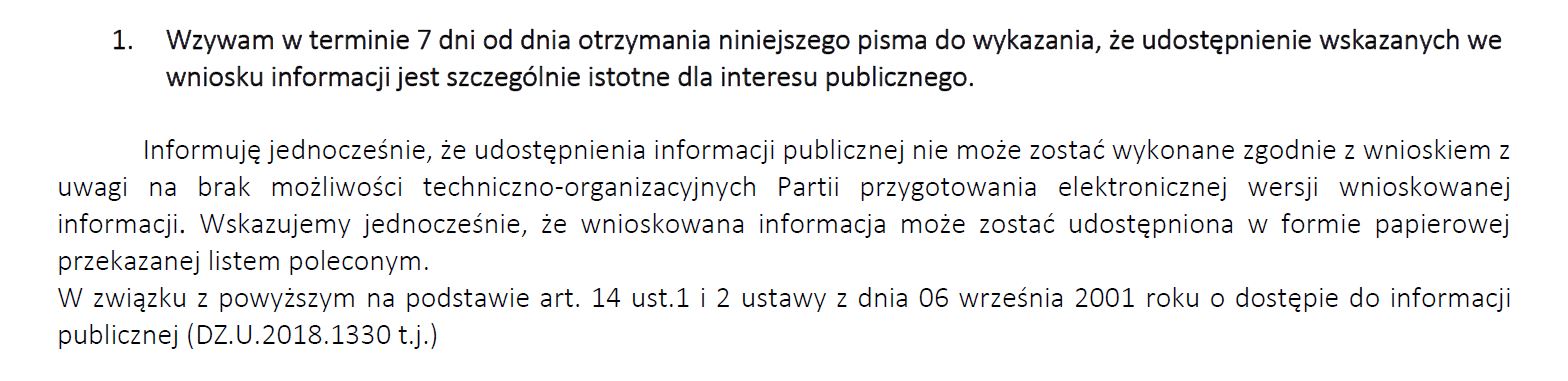 Partia wezwała nas do wykazania szczególnie istotnego interesu publicznego. Naszym zdaniem wniosek nie dotyczy informacji publicznej przetworzonej, a prostej, dlatego nie będziemy uzasadniać naszego wniosku. Jednak wyślemy nagranie wypowiedzi lidera partii, który wskazuje, jaki powinien być standard jawności: ”Wiosenna porządki” Roberta Biedronia. Wielka akcja sprawdzania zarobków w urzędach.