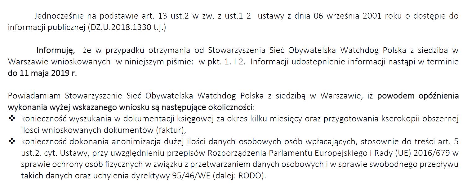 Partia zapowiedziała, że zrealizuje wniosek do 11 maja 2019 r., nie przejmując się zasadą mówiącą o szybkości postępowania, wynikającą z ustawy o dostępie do informacji publicznej. Wiosna uznała, że maksymalnie wydłuży termin odpowiedzi i przekaże dane 2 miesiące po otrzymaniu wniosku. Zapomniała jednak, że art. 13 ust. 1 ustawy o dostępie do informacji publicznej przewiduje obowiązek wykonania wniosku bez zbędnej zwłoki, nie później jednak niż w terminie 14 dni od dnia złożenia wniosku. Możliwość odroczenia tego terminu jest wyjątkowa. Ciekawe, co nas czeka za 2 miesiące?