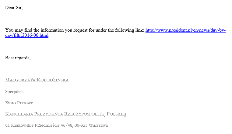 Jednocześnie w dniu rozprawy Kancelaria Prezydenta RP, odpowiadając na wniosek Gurkana Tatara (odbywa w Sieci Obywatelskiej Watchdog Polska praktyki) o udostępnienie kalendarza Prezydenta, wskazała: