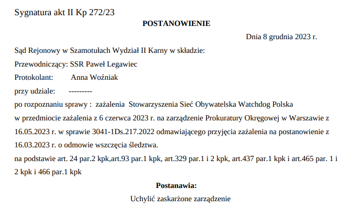 Co to oznacza? Otóż Prokuratura Okręgowa w Warszawie będzie musiała przekazać do Sądu Rejonowego w Szamotułach nasze zażalenie na postanowienie o umorzeniu postępowania. Sąd Rejonowy będzie merytorycznie badał to zażalenie, w tym w szczególności nasze argumenty dotyczące sprzeczności tzw. “ustawy abolicyjnej” z prawem Unii Europejskiej. Jeśli Sąd Rejonowy uwzględni zażalenie, to otworzy Watchdogowi ścieżkę do wniesienia aktu oskarżenia przeciwko ponad 130 wójtom i burmistrzom, którzy nielegalnie przekazali dane osobowe wyborców Poczcie Polskiej S.A.
