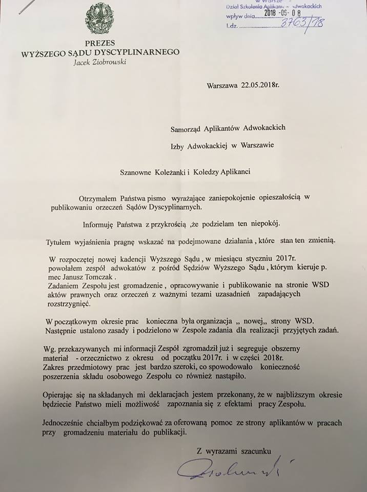 Prezes Wyższego Sądu Dyscyplinarnego Adwokatury odniósł się do listu i wskazał, iż został powołany odpowiedni zespół, który zgromadzi i opublikuje odpowiednie orzeczenia na stronie Sądu.