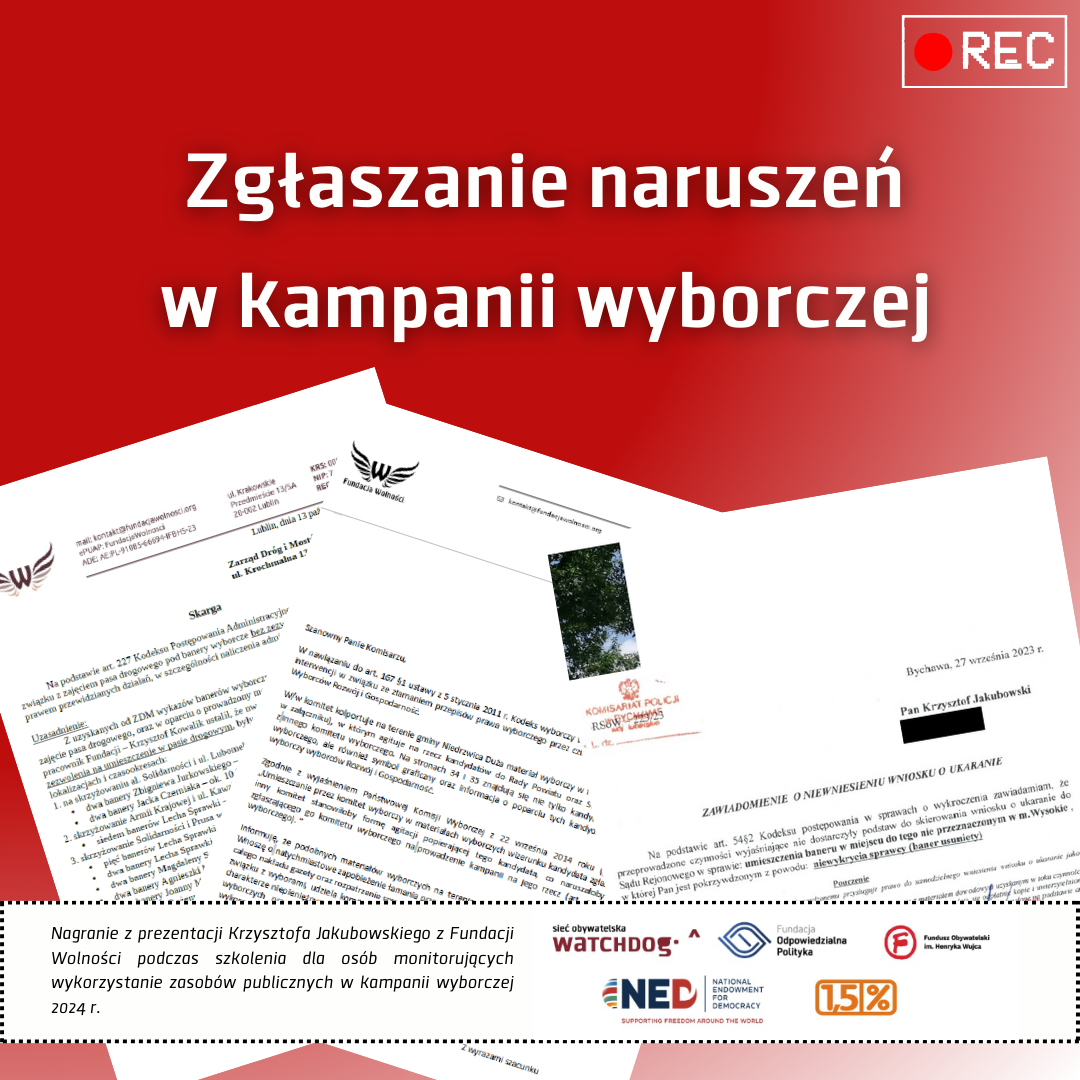 Zapraszamy do obejrzenia nagrania z prezentacji Krzysztofa Jakubowskiego z Fundacji Wolności, członka Sieci Obywatelskiej Watchdog Polska, który opowiada o zgłaszaniu naruszeń komitetów w kampanii wyborczej.