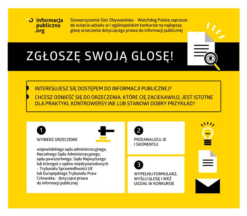 Interesujesz się dostępem do informacji publicznej? Chcesz odnieść się do orzeczenia, które Cię zaciekawiło, jest istotne dla praktyki, kontrowersyjne, lub stanowi dobry przykład? Napisz glosę i weź udział w konkursie.