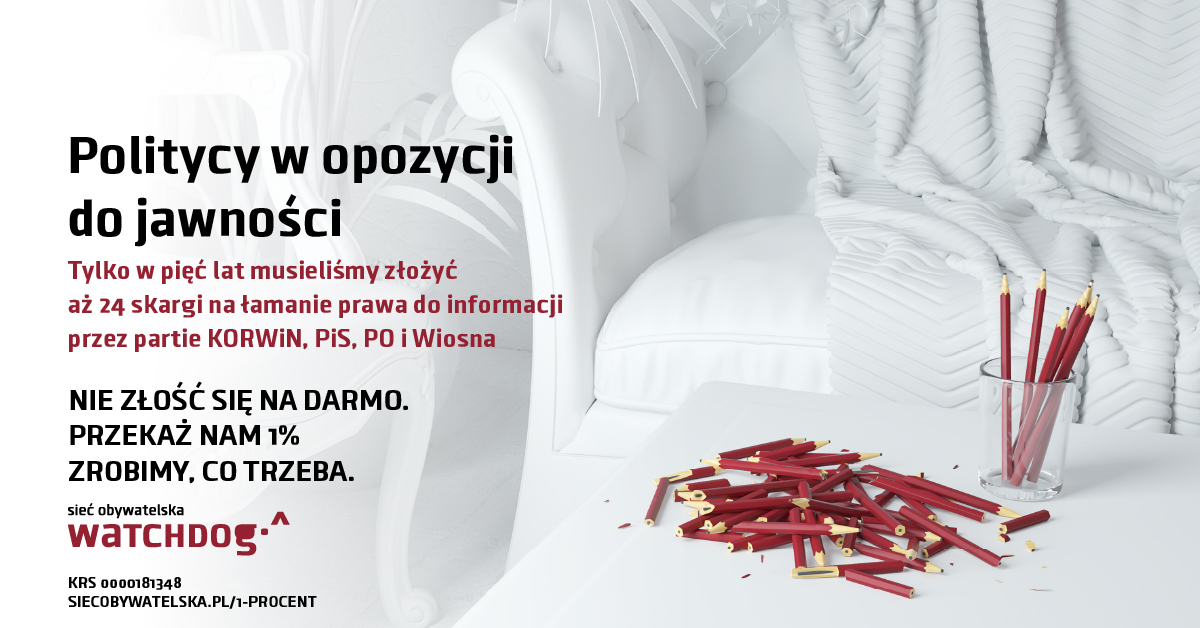 Zeszły rok był wyjątkowo trudny dla nas wszystkich z powodu pandemii. Niestety także politycy i osoby publiczne swoimi nieprzemyślanymi decyzjami i wypowiedziami wystawiały nasze nerwy na próbę. Być może niejednokrotnie miałaś/miałeś ochotę rzucić w monitor komputera bądź telewizor czymś ciężkim, słysząc o kosztach wyborów, których nie było czy potężnym zastrzyku finansowym dla TVP, kiedy Ty w tym czasie zmagałaś/zmagałeś się z wyzwaniami zdalnej szkoły swoich dzieci, dowiadywałaś/dowiadywałeś się, że tarcza z pomocą od rządu Cię nie obejmie, czy po prostu czułaś/czułeś się przytłoczony medialnymi doniesieniami na temat przedłużającej się pandemii. Złość w Tobie wzbierała. Chcemy, byś miała/miał jak najmniej powodów do złości, by państwo było przyjazne obywatelom, a władze podejmowały jawne i przemyślane decyzje. Wiemy, jak to zrobić, ale potrzebujemy Twojej pomocy. Przekuj swoją złość w coś konstruktywnego. Nie złość się na darmo, przekaż nam 1% podatku, a my zrobimy co trzeba, żeby rozliczać rządzących z powierzonych im przez obywatelki i obywateli zadań. Aby przekazać nam 1% podatku, wystarczy, że wpiszesz nasz numer KRS 0000181348 w swoim rozliczeniu za 2020 rok.